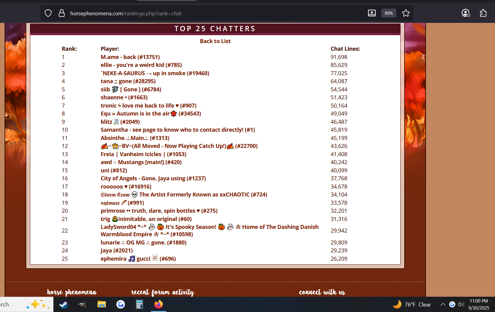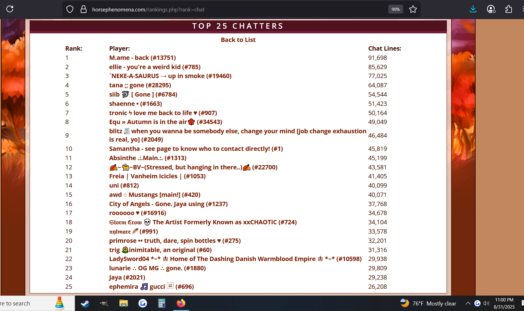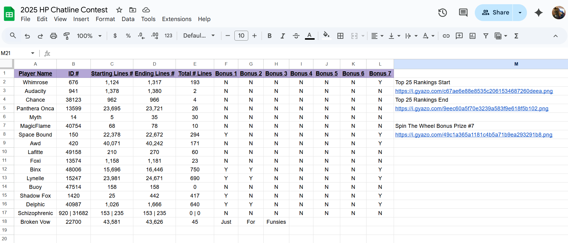 ~ Your Top 5 Chatters ~ First Place: Binx (#48806) Second Place: Lynelle (#15247) Third Place: Delphic (#40987) Fourth Place: Shadow Fox (#1420) Fifth Place: Space Bound (#150) * This year's combined total of all participation has tallied to 3,355 lines for the Chat Room! * Top 25 Chatline Contest Start Top 25 Chatline Contest End (Please Note: The timestamp shown on my computer shows me being 1hour behind HP's time) Chatline Contest Records & Bonuses Spin The Wheel Result Bonus #7 (*Messages will be sent out shortly for prizes* - Thanks for being patient with me!) :D ![]() ![]() ![]() |