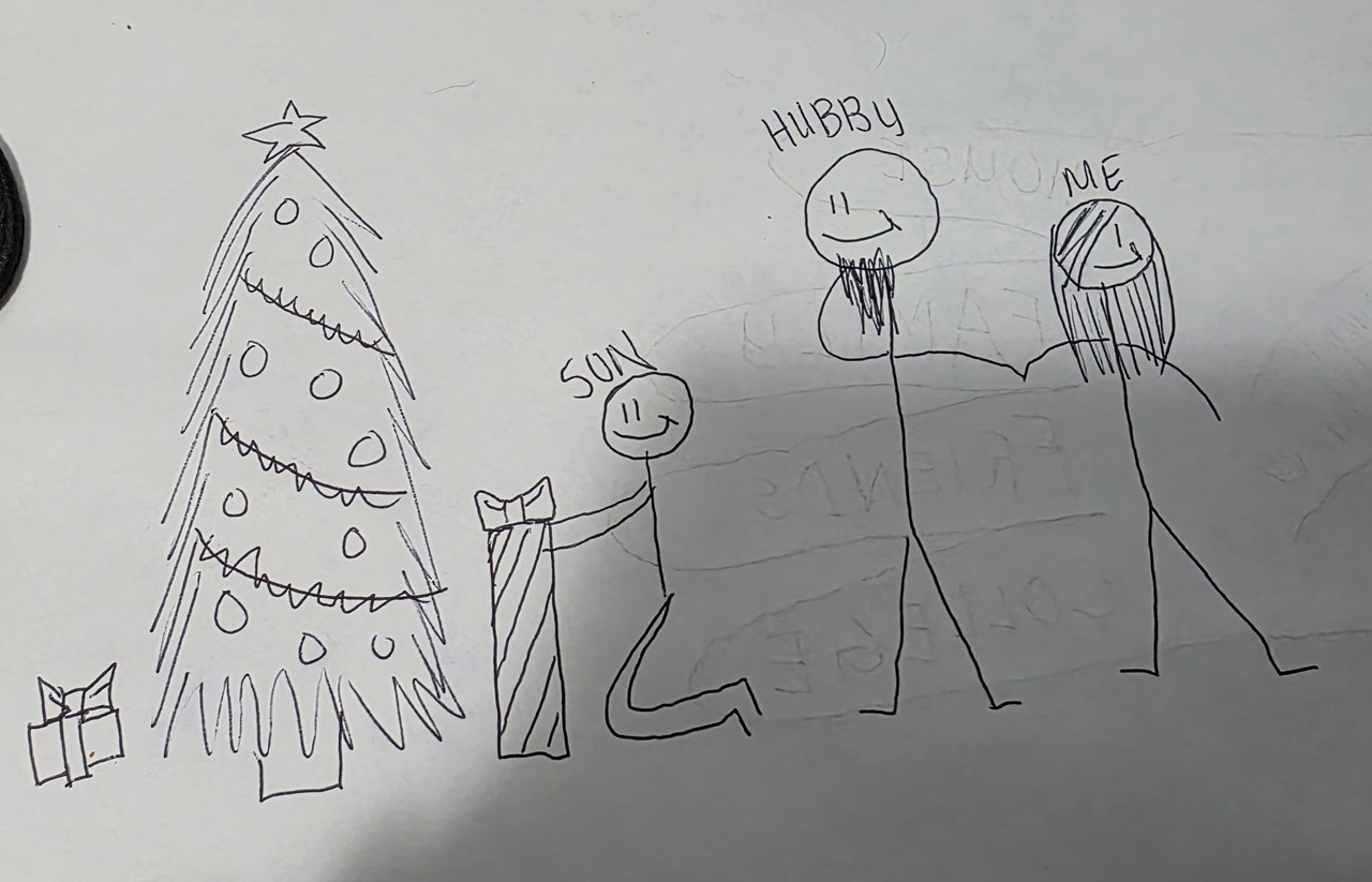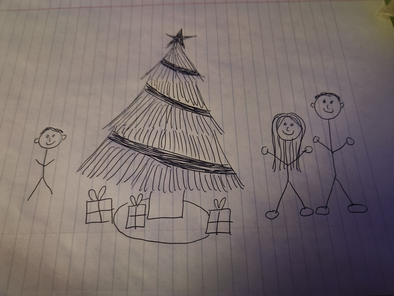My husband, my kitties, a cup of hot cocoa with all our presents under the tree! (a very crude drawing I did at work lol). Points here please :) |